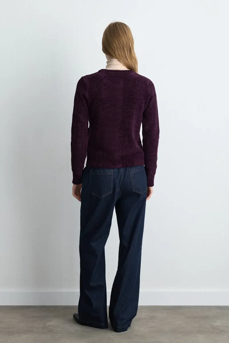 The mulberry tone adds a sophisticated elegance. The velvet texture offers a soft shine. Its knit structure creates a light and comfortable feel. With its classic cut, it easily adapts to any setting. It stands out as an elegant complement from day to night.