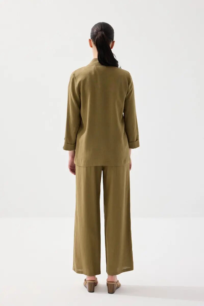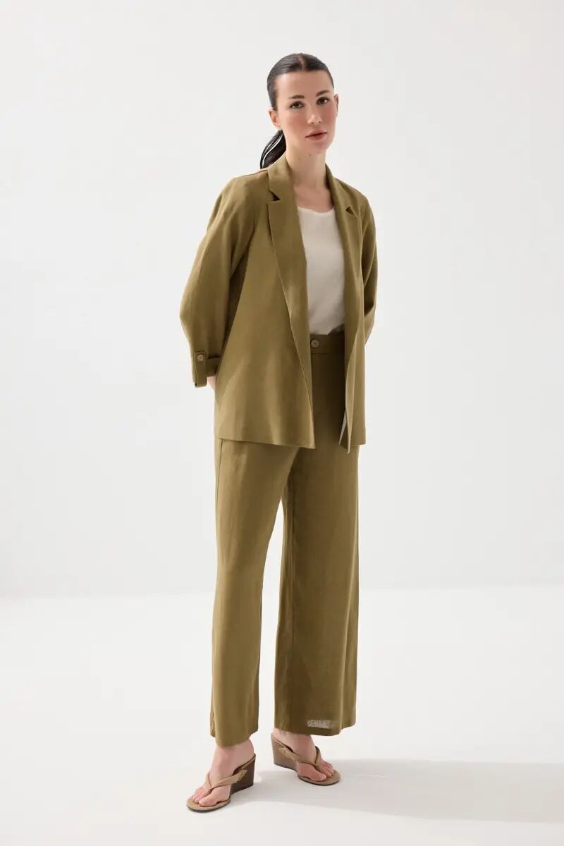 Viskon Keten Rahat Kesim Astarsız Ceket & Bol Paça Pantolon Takım - Haki