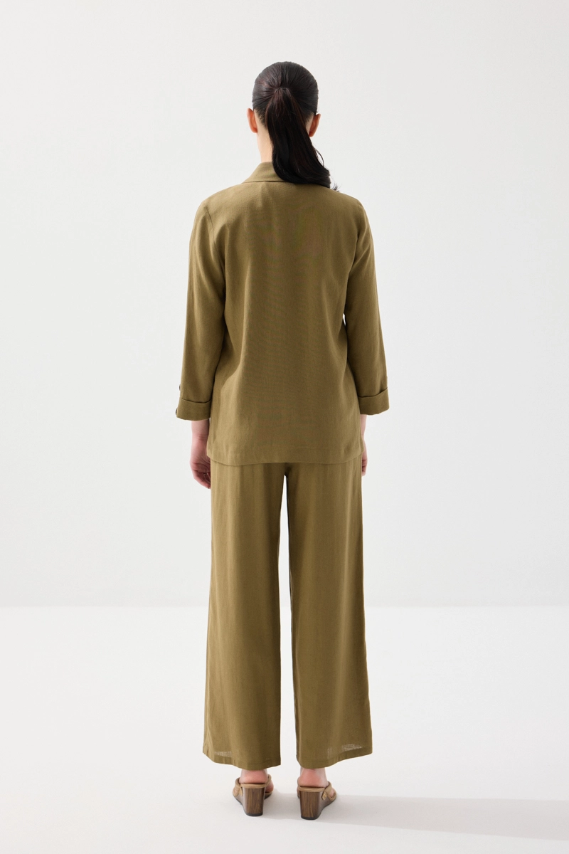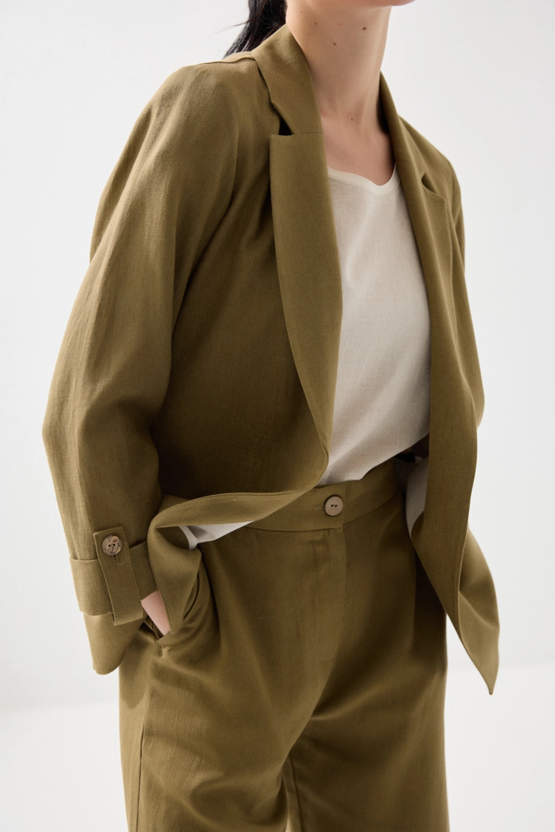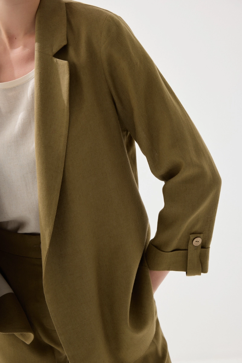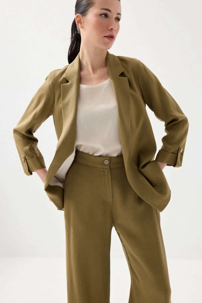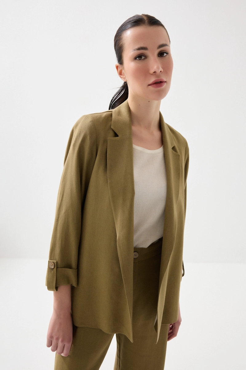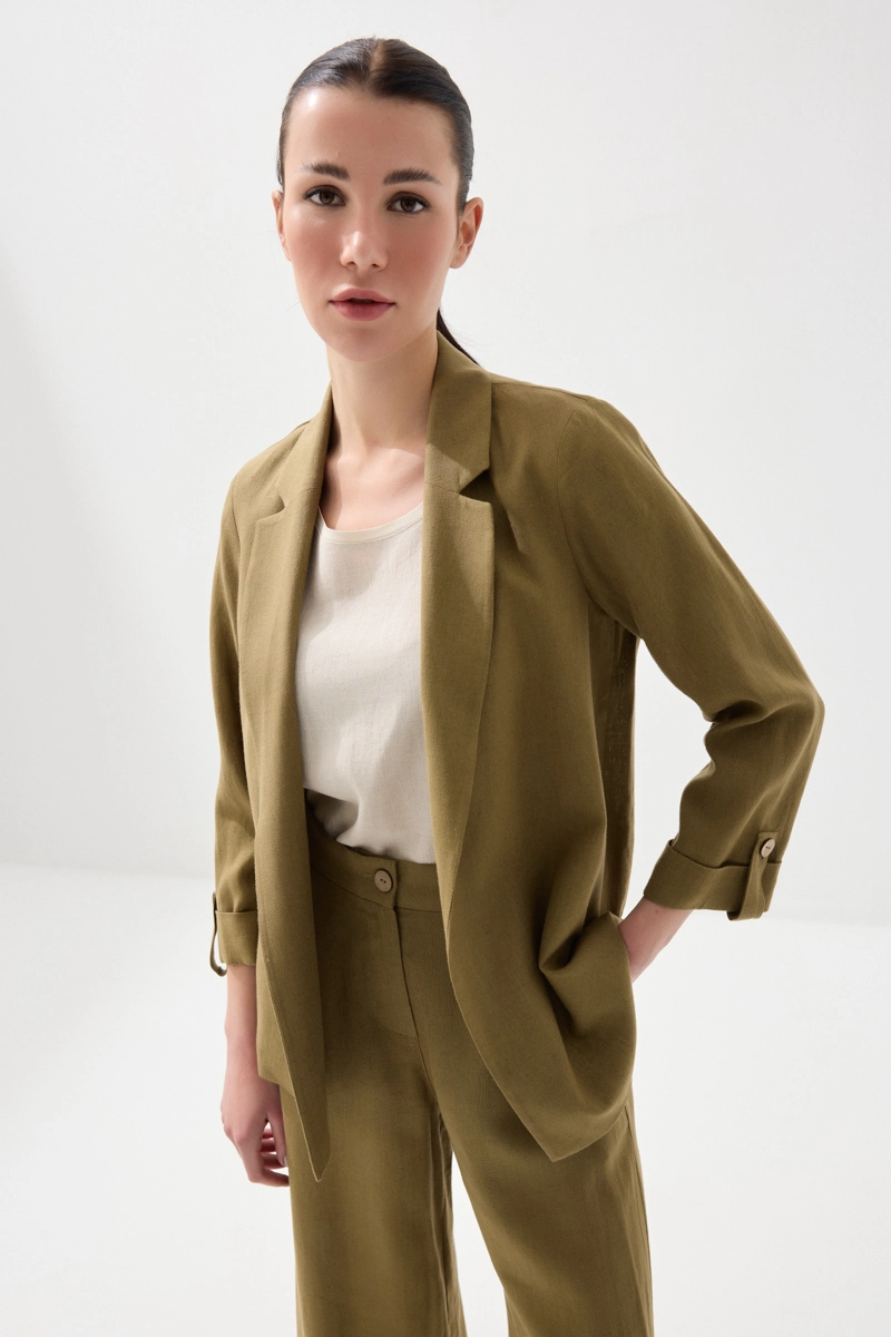 Viskon keten karışımlı kumaşıyla hafif ve nefes alabilen bir kullanım sunan ceket, astarsız yapısıyla ferah bir deneyim sağlar. Rahat kesimiyle gün boyu konfor sunar. Haki rengiyle doğal ve modern kombinler oluşturabilirsiniz. Günlük ve ofis stiline kolayca uyum sağlar. Şık ve fonksiyonel bir parçadır.