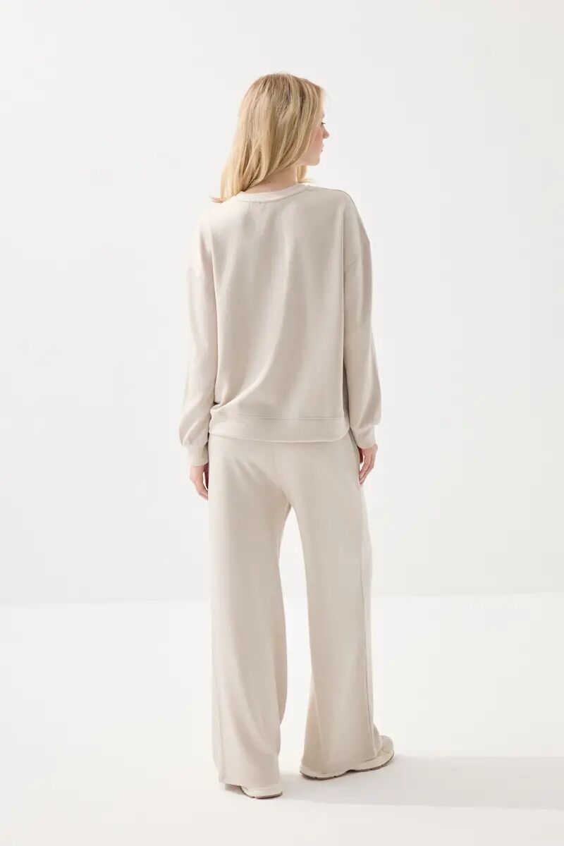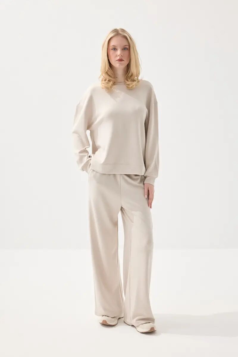 Viskon Sweatshirt & Bol Paça Eşofman Altı Takım- Bej