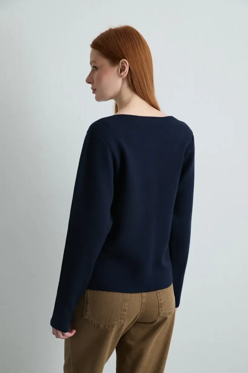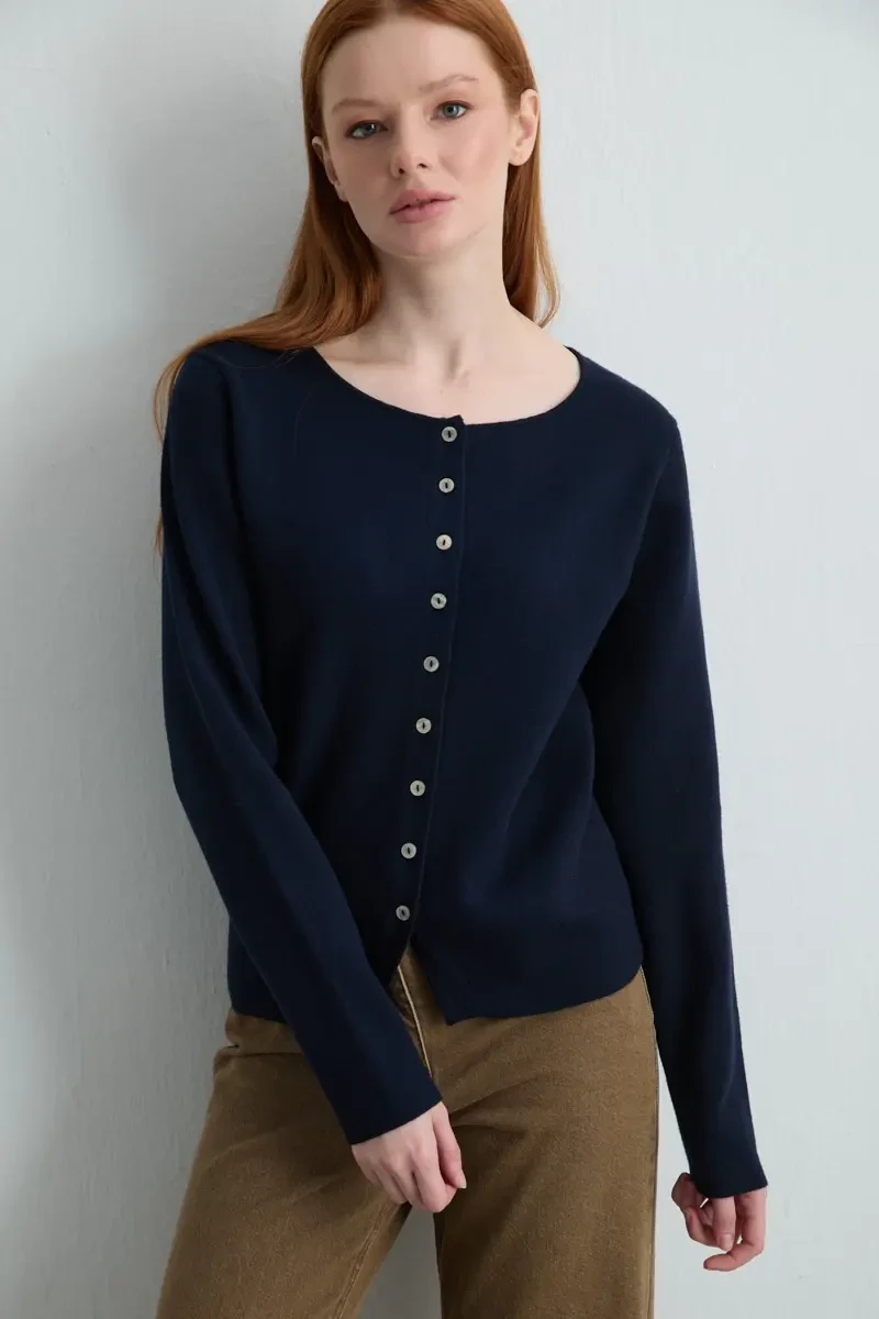 Navy viscose knit cardigan combines classic knit texture with stylish design. Its relaxed fit offers comfort for daily wear, while its sophisticated look complements layered outfits.