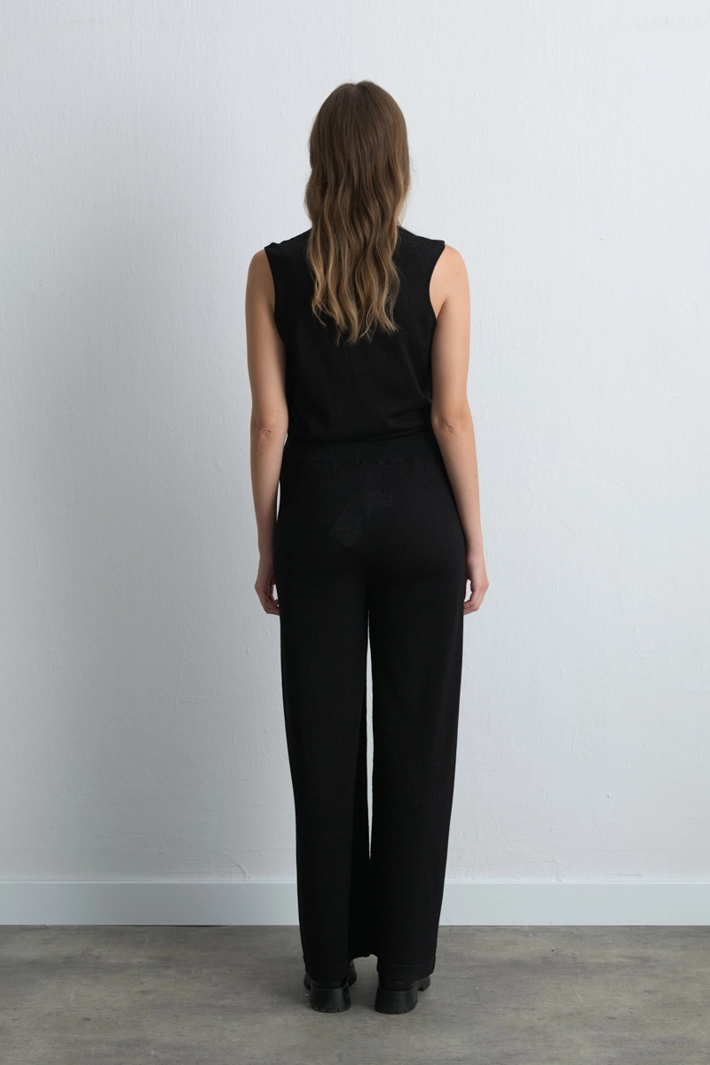 The black viscose knit trousers combine the sophistication of black with shimmering details, offering both comfort and elegance. Its soft texture provides ease of wear, while the glittering finish adds sparkle to your outfits. A modern piece suitable for both casual and evening styles.