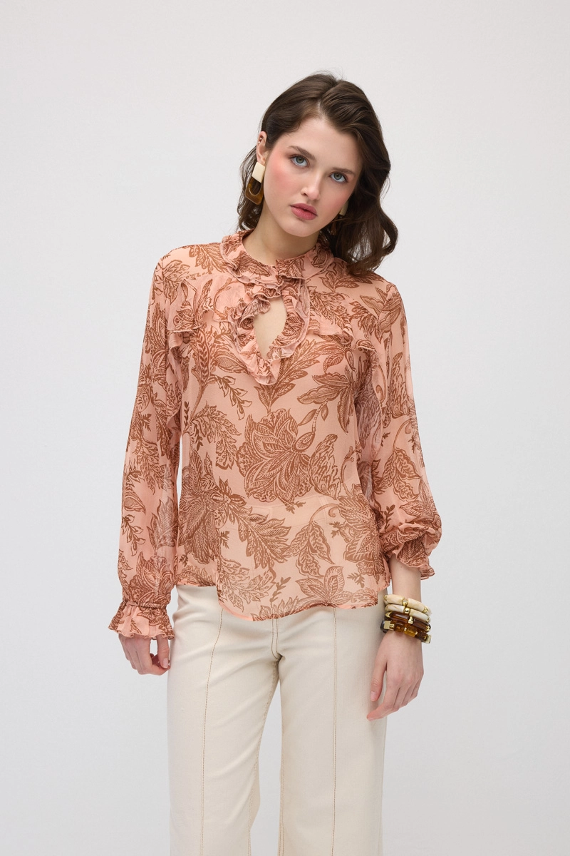 Yaprak desenleriyle canlı ve zarif bir stil oluşturur. Rayon şifon dokusu hafif ve akışkan bir yapı sunar. Volan detayları tasarıma hareket kazandırır. Feminen ve romantik kombinler için ideal bir parçadır.