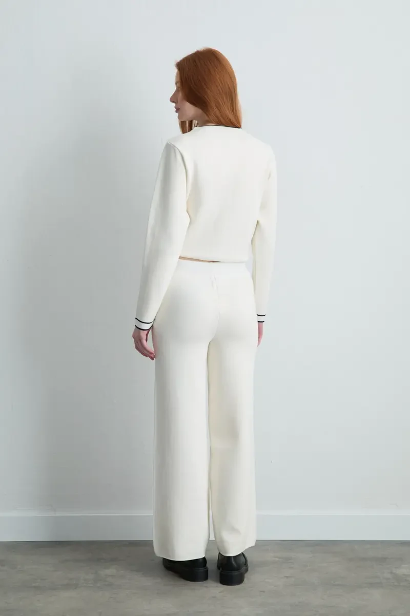 Ecru pants with wide-leg cut provide a comfortable and modern style. Knit fabric ensures a comfortable fit, complementing daily outfits. Minimal design allows easy pairing with various tops.