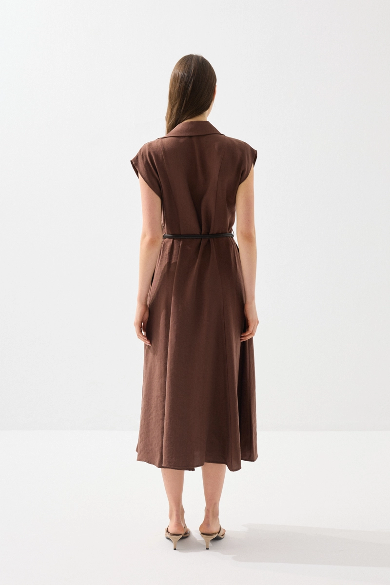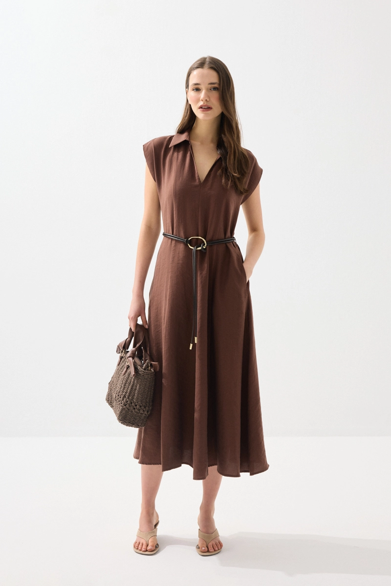 Yumuşak ve nefes alabilen tencel kumaşıyla konfor sunan uzun elbise, yakalı ve kemerli tasarımıyla şık bir duruş sergiler. Bel vurgusu sayesinde zarif bir siluet oluşturur. Kahverengi tonu ile doğal ve sofistike kombinler yapabilirsiniz. Günlük ve ofis şıklığında rahatlıkla tercih edilebilir. Modern ve zamansız bir parçadır.