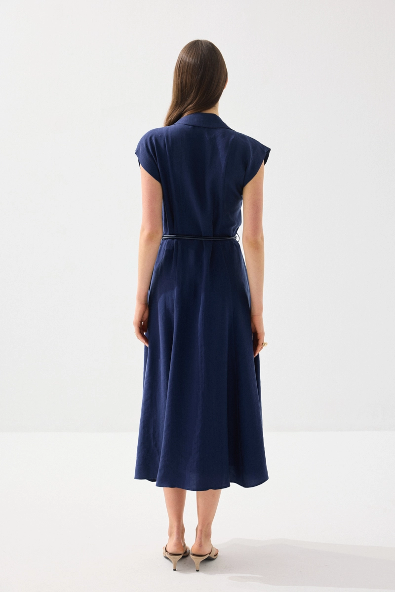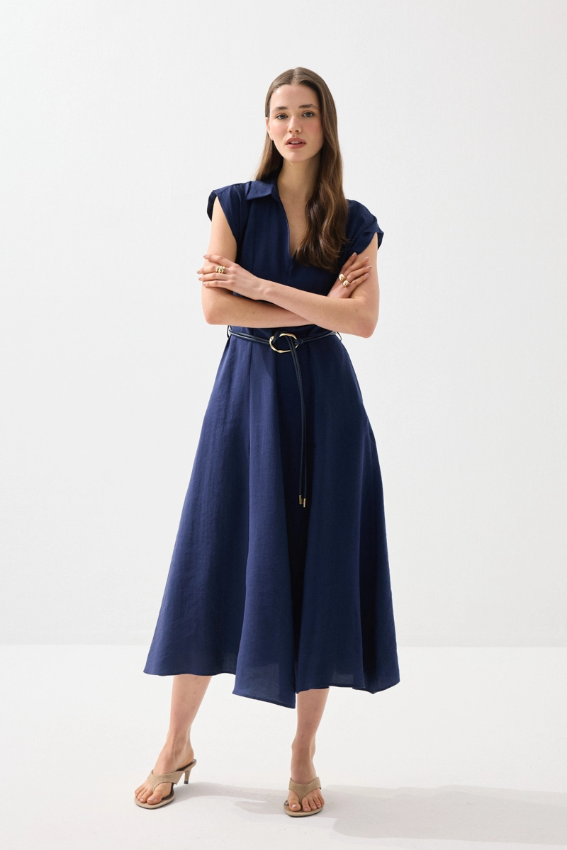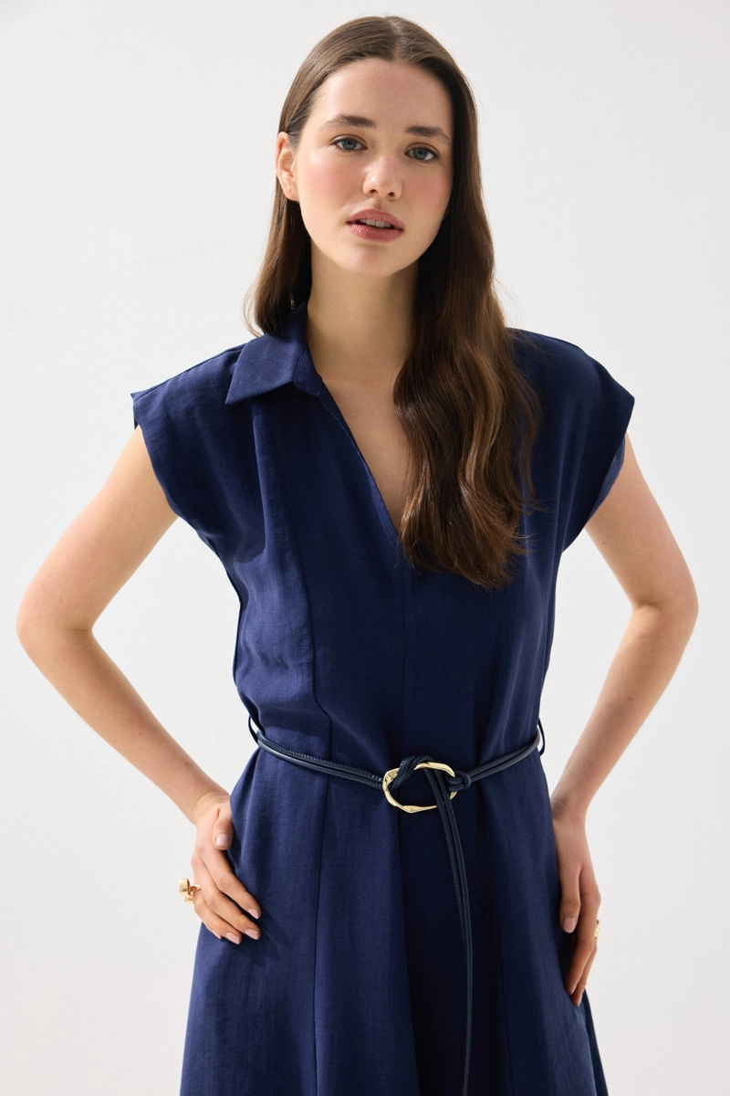Yumuşak ve nefes alabilen tencel kumaşıyla konfor sunan uzun elbise, yakalı ve kemerli tasarımıyla zarif bir görünüm sağlar. Bel vurgusu ile feminen bir siluet oluşturur. Lacivert rengiyle şık ve zamansız kombinler yapılabilir. Günlük ve özel anlarda rahatlıkla tercih edilebilir. Modern ve zarif bir parçadır.
