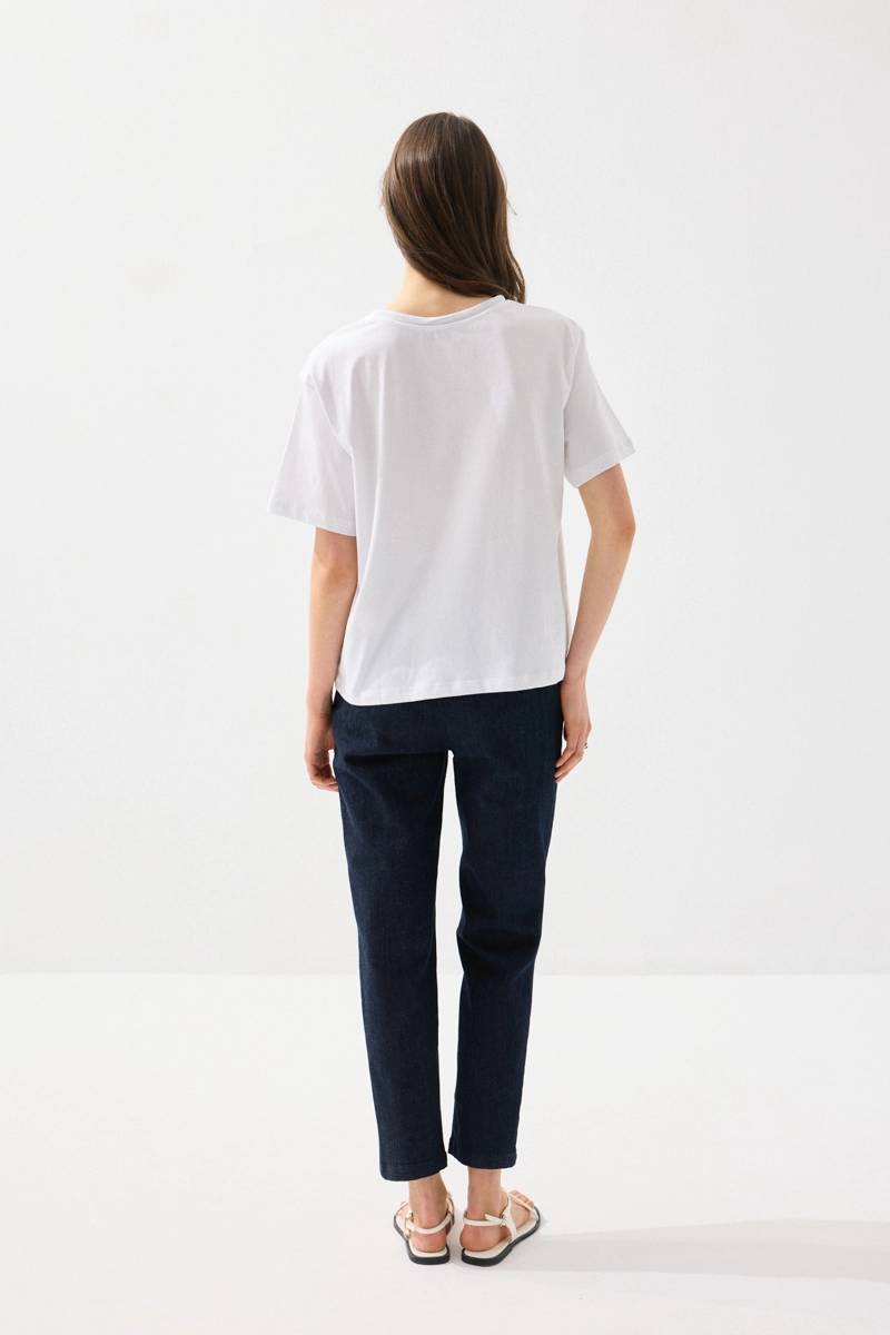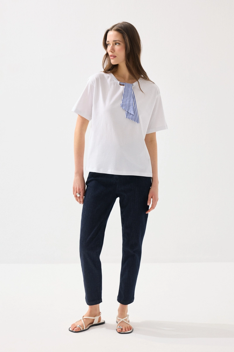 Yumuşak pamuk dokusuyla konfor sunan t-shirt, yakasındaki fular detayıyla şık bir görünüm kazanır. Hafif yapısı sayesinde gün boyu rahatlık sağlar. Beyaz rengiyle her kombinle kolayca uyum sağlar. Günlük stilinize zarif bir dokunuş katar. Modern ve feminen bir parçadır.