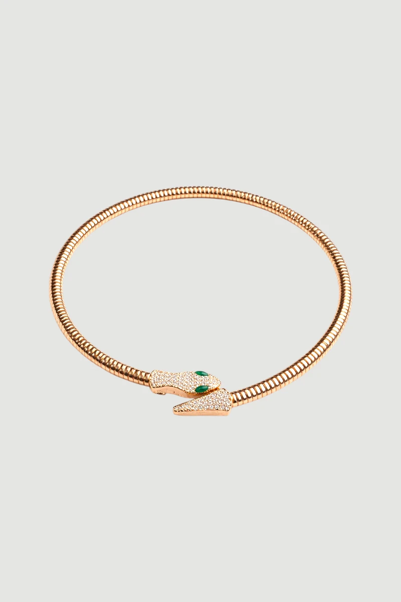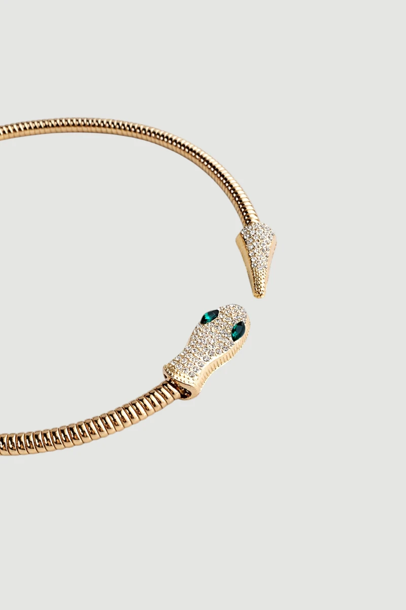 Özgün formu ve taş detaylarıyla dikkat çeken bu tasarım, iddialı bir stil sunar. Parlak yüzeyi sayesinde göz alıcı bir görünüm sağlar. Gold tonu ile sıcak ve çarpıcı bir etki yaratır. Özel davetlerde kombinlerin öne çıkan parçası olur. Modern ve güçlü bir aksesuar arayanlar için ideal bir tercihtir.