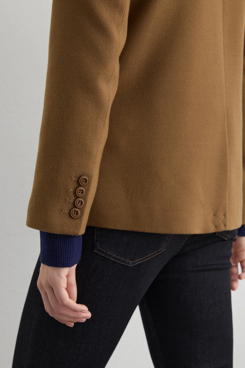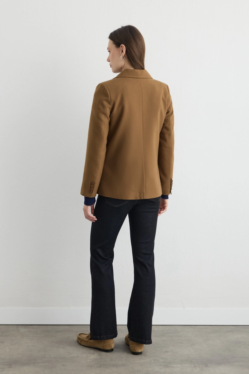 Camel tonundaki blazer ceket, sıcak ve doğal rengiyle stilinize zarif bir dokunuş katar. Yünlü dokusu, konforlu ve yumuşak bir kullanım sunar. Klasik kesimi, hem iş hem de günlük kombinlerde şık bir görünüm yaratır. Minimal detayları ve modern silueti sayesinde her gardırop için ideal bir parçadır.