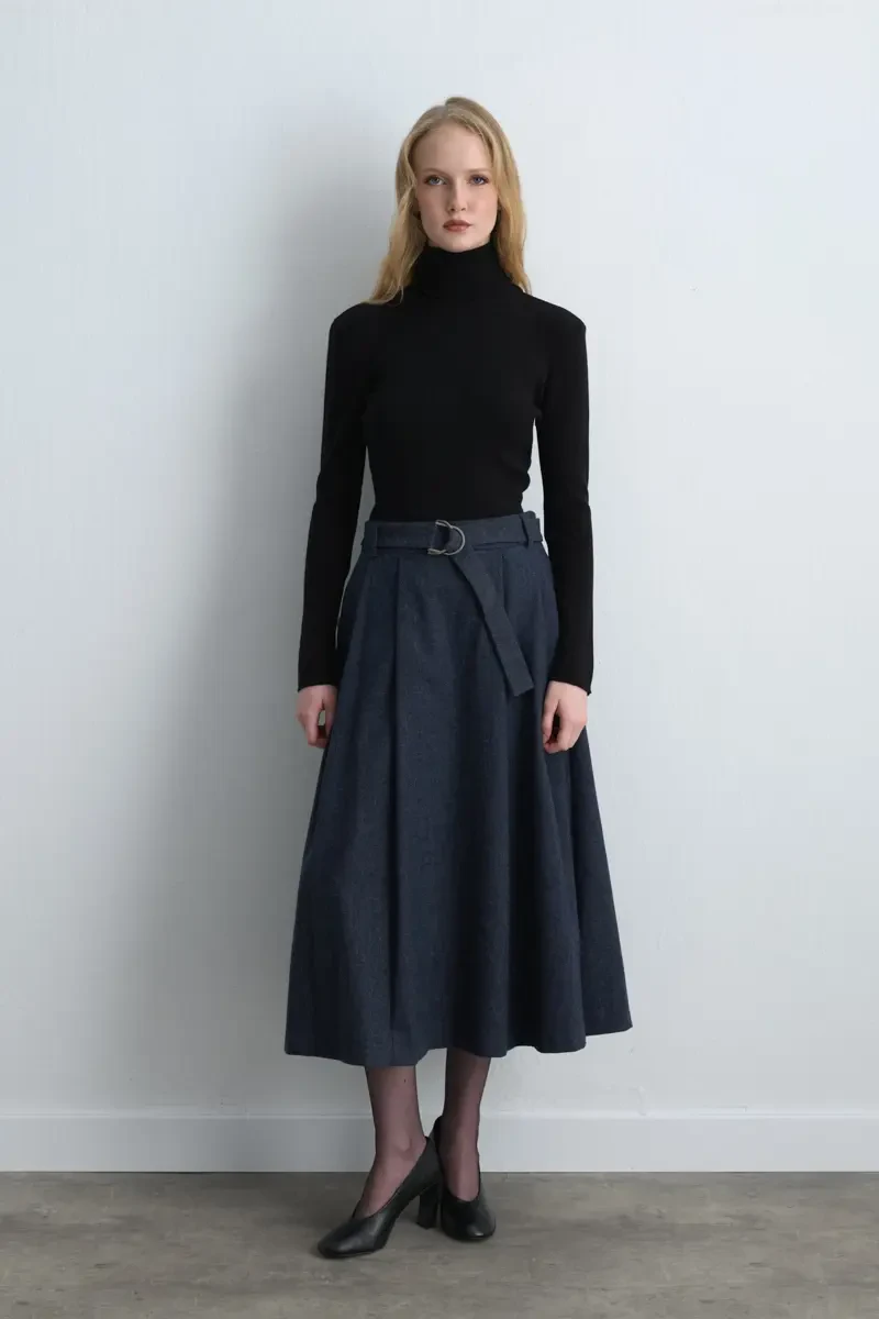 Zarif duruşu ve dökümlü formuyla dikkat çeken bu uzun kloş etek, yünlü kumaşı sayesinde kış aylarında sıcak bir kullanım sunar. Lacivert rengiyle her stile kolayca uyum sağlar. Hem klasik hem de modern kombinlerde kullanılabilecek şık bir parçadır. Çizme ve kabanlarla tamamlandığında sofistike bir görünüm elde edilir.