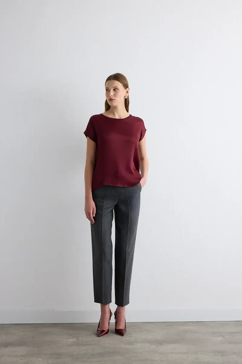 Saten ön yüzeyi şık bir ışıltı sunar. Yuvarlak yaka detayı sade bir görünüm kazandırır. Bordo rengiyle güçlü bir duruş sergiler. Rahat kesimiyle günlük stil için uygundur. Katmanlı kombinlere kolayca uyarlanabilir.