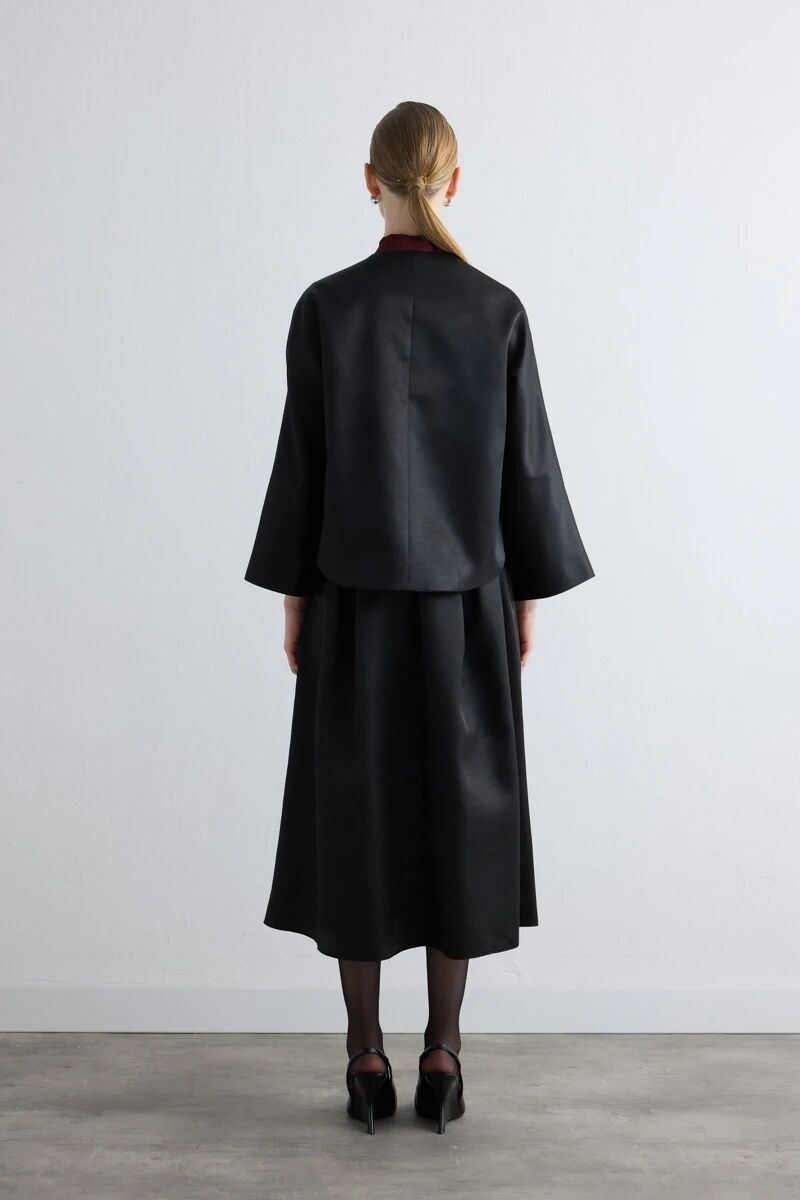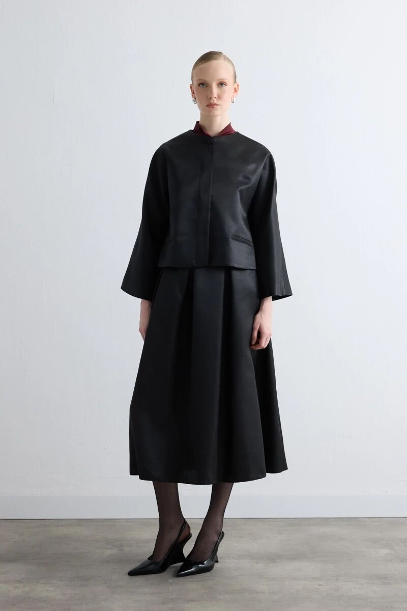 Yuvarlak Yaka Tafta Ceket & Midi Etek - Siyah Takım