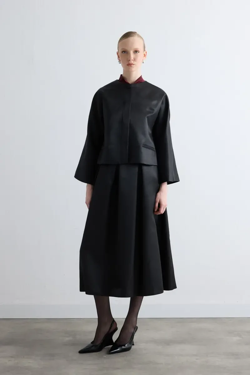 Parlak dokusuyla sofistike bir şıklık sunar. Yuvarlak yaka detayı zarif bir duruş kazandırır. Siyah tonu sayesinde farklı kombinlerle kolayca uyum sağlar. Hem özel davetlerde hem şehirli günlük stillerde modern bir tamamlayıcı olur.