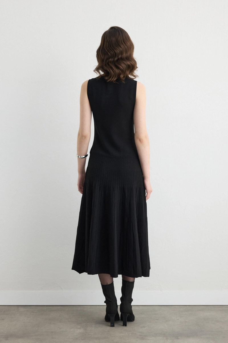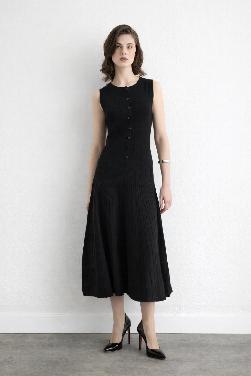 Yuvarlak yaka sade ve klasik bir görünüm sağlıyor. Pileli detaylar hareket ve derinlik katıyor. Siyah tonları her ortamda şık bir duruş sunuyor. Triko dokusu konforlu bir kullanım sağlıyor. Günlük veya özel davet kombinlerinde tercih edilebiliyor. Zarif kesim silueti ön plana çıkarıyor.