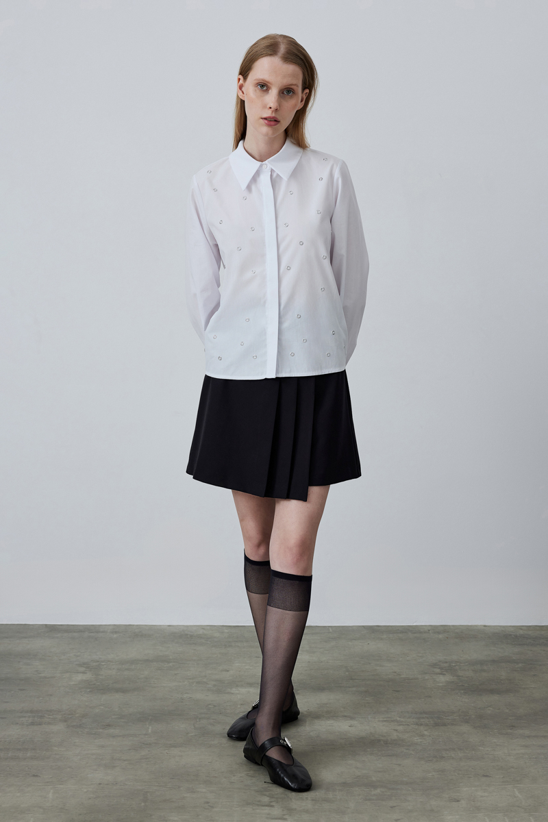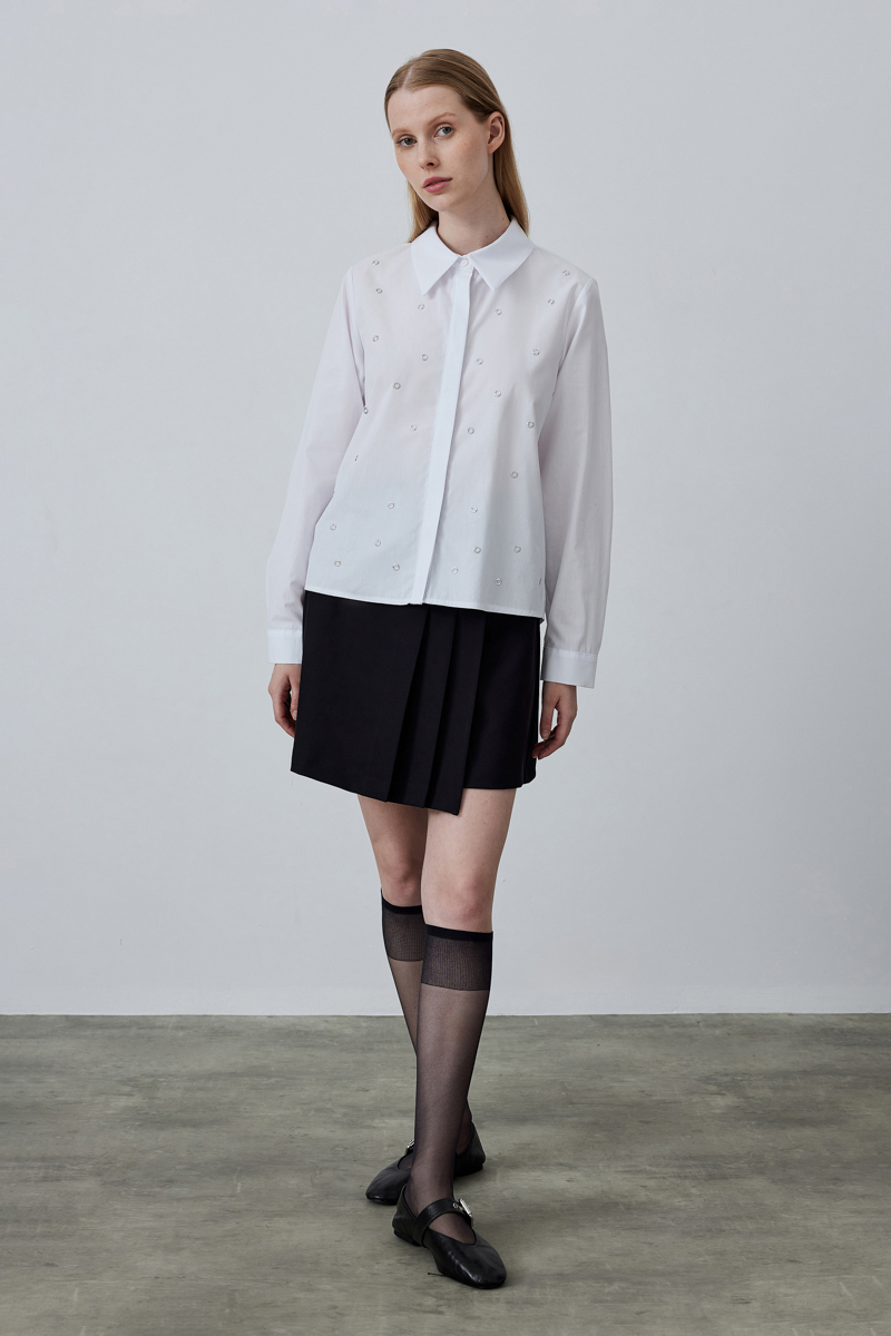 Beyaz zımbalı koton gömlek, modern detayları ve rahat kalıbıyla günlük stil için güçlü bir alternatif sunar. Jean ve kumaş pantolonlarla kolayca kombinlenir.