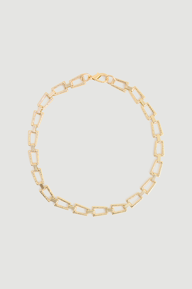 Zincir tasarımı modern ve dikkat çekici bir stil yaratıyor. Gold rengi sofistike ve şık bir görünüm sunuyor. Günlük ve akşam kombinlerinde stilin odak noktası oluyor. Minimal detaylarla zarif bir etki sağlıyor. Hafif yapısı rahat kullanım sunuyor. Her kombine uyum sağlayan şık bir aksesuar sunuyor.